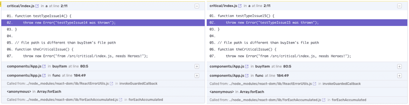 Even if a set of issues in the Issues Stream looks similar, if they are separate then there is something that still differs. In this example, it's the function name at the top of the stack trace: